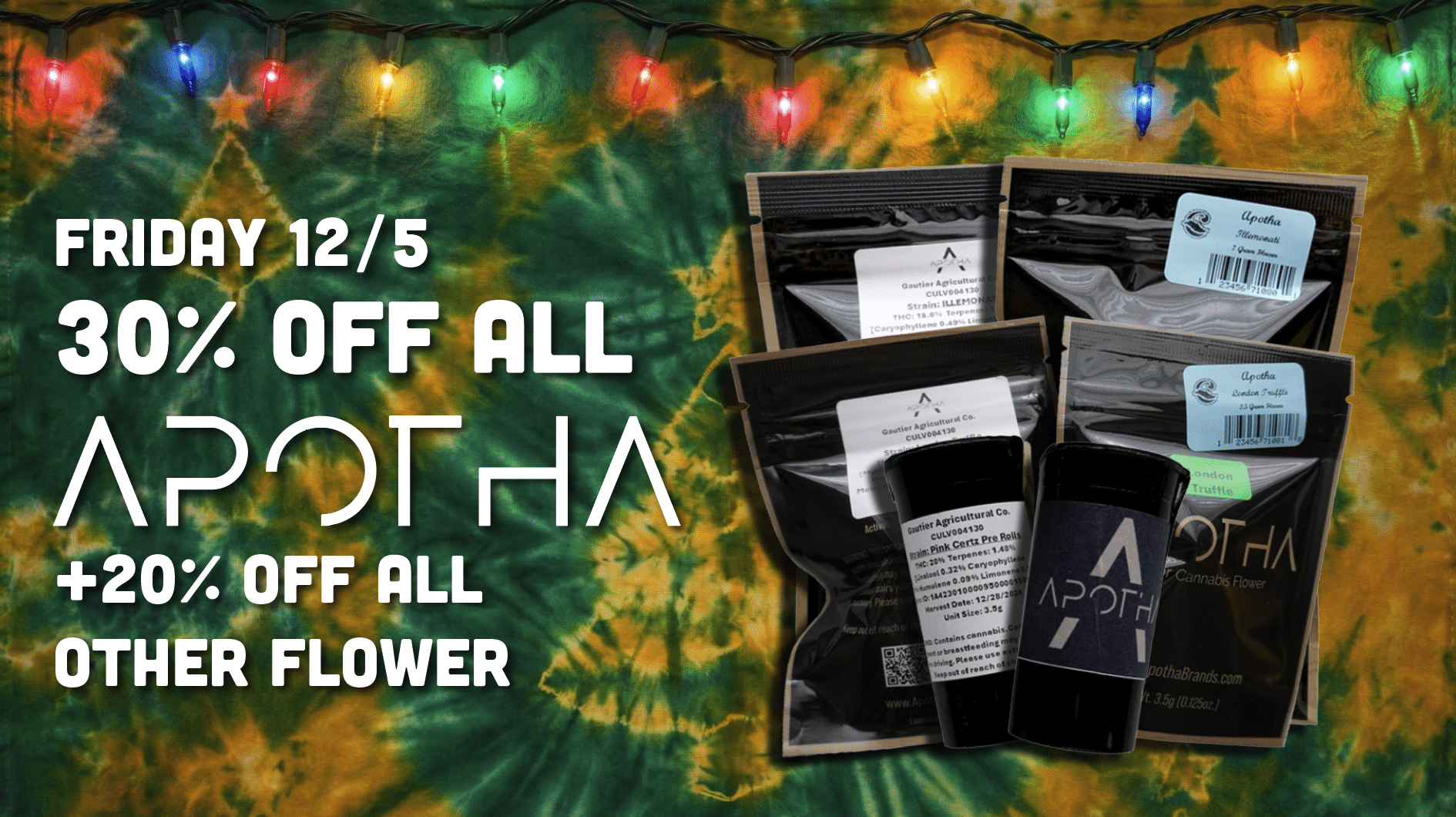 See you Friday, 12/5, for 30% off all Apotha products! Plus, 20% off all other flower for Flower Friday! Deals do not stack