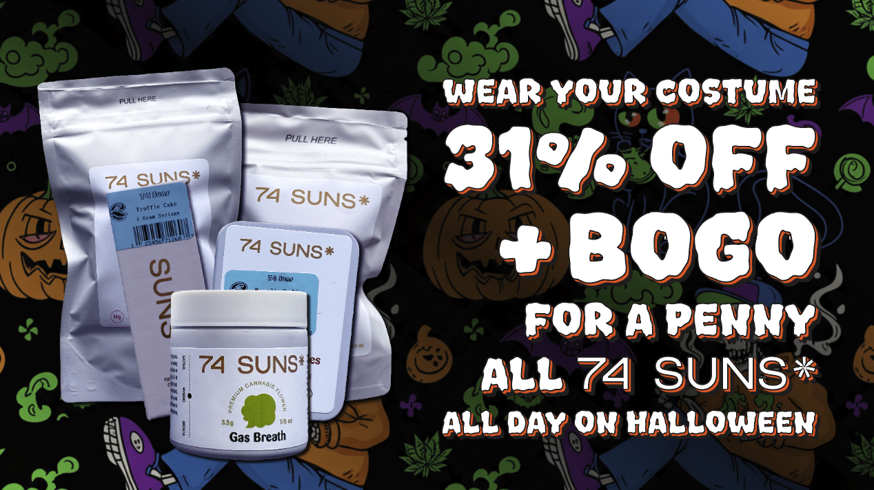 Happy Halloween! Stop by in your costume for 31% off all meds, 20% off without a costume. Plus Nick from 74 Suns will be here with BOGO for a penny all 74 Suns! 🎃 *Deals do not stack*