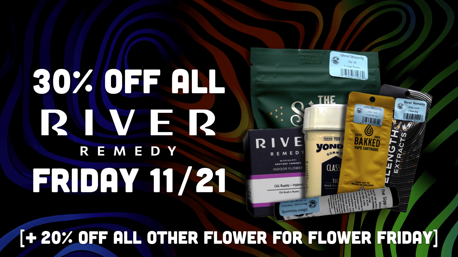 See you for 30% off all River Remedy brand products (River Remedy, The Sipp, Wavelength, Bakked, Yonder) all day long! Plus 20% off all other flower for Flower Friday